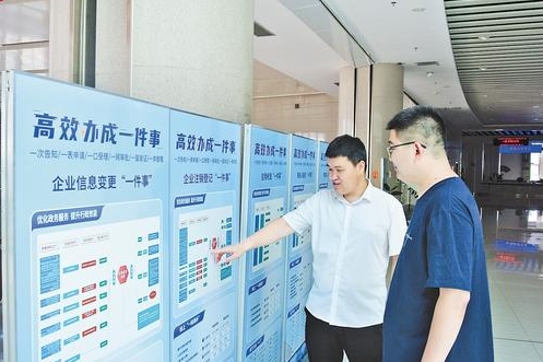 6月24日,沧州市政务服务中心工作人员(左)为办事群众介绍企业注销登记“一件事”办理流程。河北日报记者 王雅楠 摄