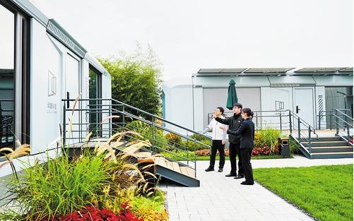 10月15日,在高碑店市奥润顺达绿建科技产业基地,讲解员(右一)为参观者介绍新一代移动装配式健康建筑“太空房”。奥润顺达集团供图
