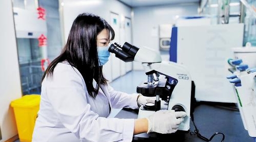 10月15日,在易度河北机器人科技有限公司实验室,检测员使用高倍显微镜观察产品灭菌后的菌落。贾子轩摄