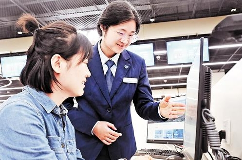 10月31日,雄安新区政务服务中心,工作人员(右)协助办事群众通过线上智能客服“雄小智”办理业务。河北日报记者 刘光昱 摄