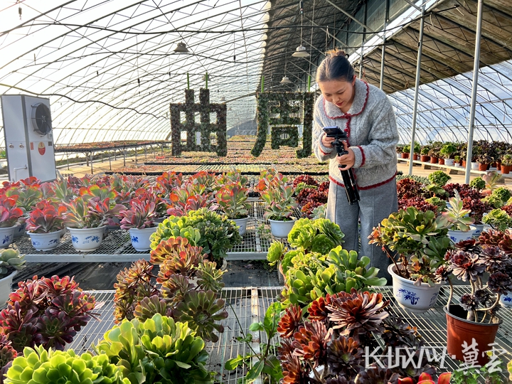 在曲周县一品一播多肉直播基地里,主播芦亚宵正通过手机向全国各地客户热情推介多肉;