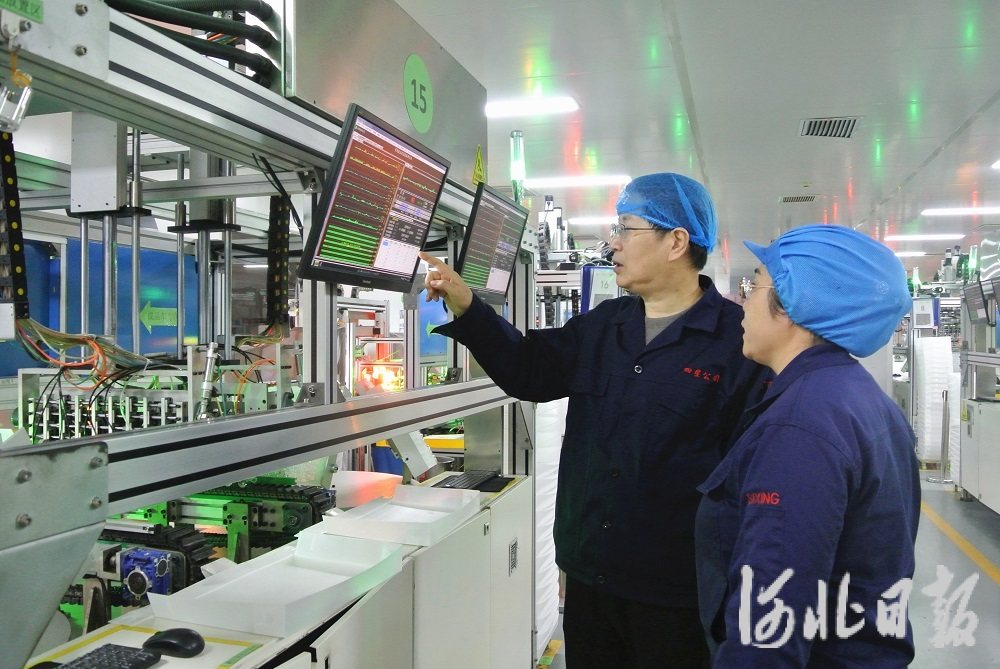 1月13日,在沧州四星玻璃股份有限公司生产车间内,首席质量官宋小龙(左)查看自动化制瓶生产线运行情况。河北日报记者 王雅楠 摄