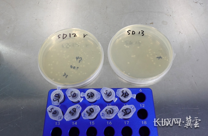 圆形培养皿中的白色斑点,就是“手术成功”的菌株。长城网•冀云客户端记者 郑建卫 摄