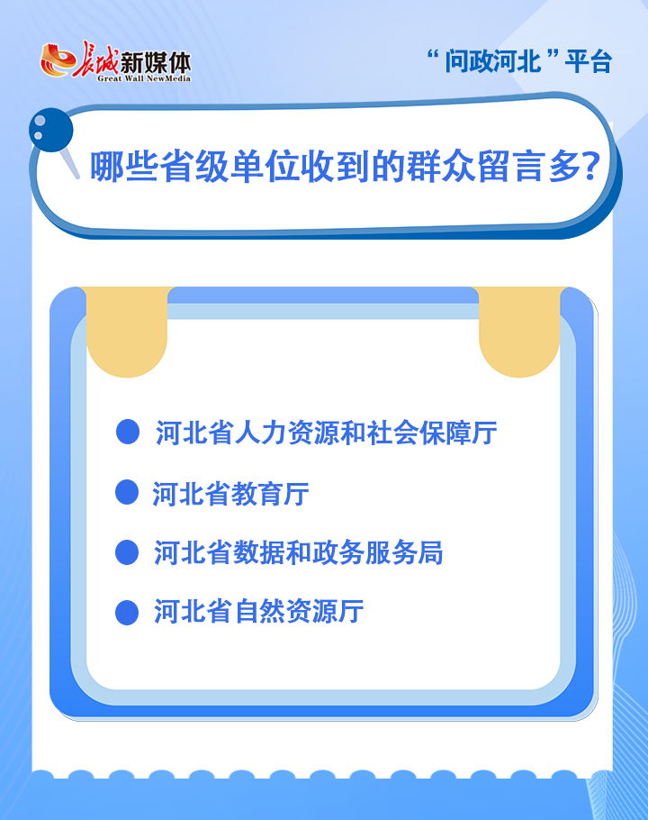 截至目前,已有40余家省级单位通过“问政河北”平台回应群众关切。其中,群众留言较多的省级单位包括:河北省人力资源和社会保障厅、河北省教育厅、河北省数据和政务服务局、河北省自然资源厅。