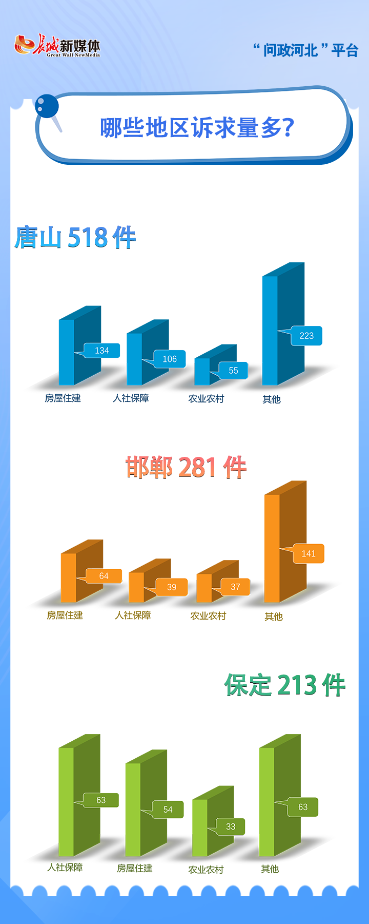 唐山、邯郸、保定等地市群众诉求量较多。